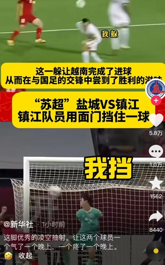 周一,新华社官方抖音账号发布苏超、国足球员的对比视频。这段视频对比了吴曦对越南一战面对横传的躲球动作以及镇江球员用脸当球的动作,配文则写到,“这脚优秀的凌空抽射。让这两个球员一个气了一个晚上,一个疼了一个晚上。”